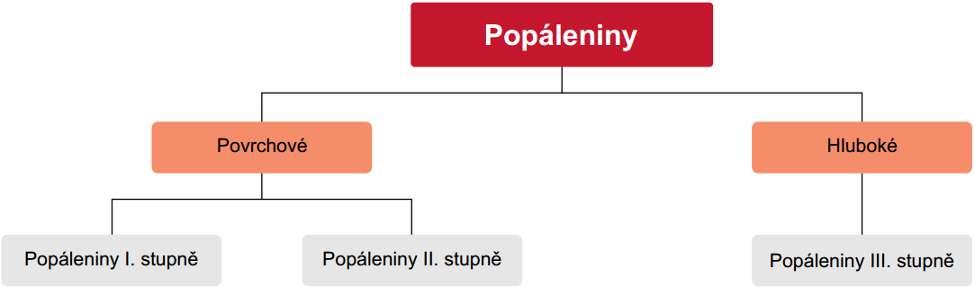 Popáleniny se rozdělují na povrchové (I. a II. stupeň), hluboké (III. stupeň).